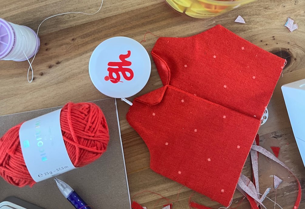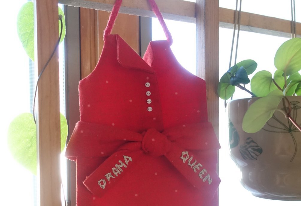 The jumpsuit is a cape-like garment that can be secured around the neck with a tie and under the belly with an adjustable velcro belt. Uma (pictured) approves.